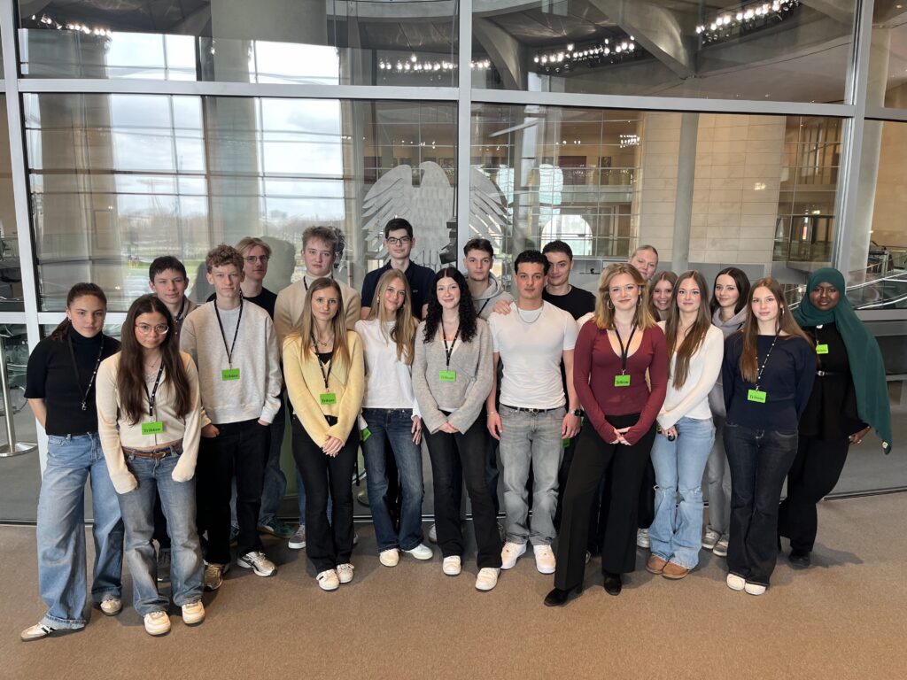 Eine Sternstunde des Parlamentarismus erlebten die Schüler:innen dann im Plenum des Bundestages, als ein fraktionsübergreifender Antrag zur pränatalen Diagnostik debattiert wurde und die Abgeordneten nicht ihrer Fraktion, sondern nur ihrem Gewissen unterworfen waren. Stichwort: Meinungs- und Gewissensfreiheit. Dies unterstrich auch Sylvia Rietenberg (Die Grünen), die unsere Berlinfahrer im Fraktionssaal der Grünen empfing.