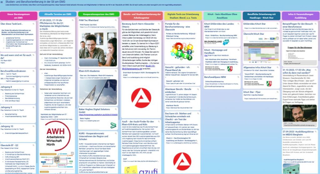 Wir haben zahlreiche Hinweise und Möglichkeiten auf einer digitalen Pinnwand (Taskcard) für Sie / Euch zusammengetragen. Ein Klick aufs Bild oder diesen Link eröffnet vielfältige Informationen zu Berufs- und Studienberatung.